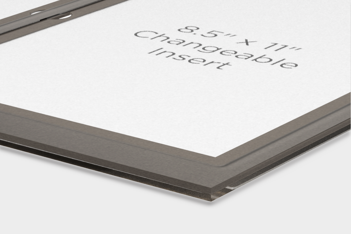• Three insert holders with protective lens covers accommodate printed 8.5" x 11" pieces of standard paper.