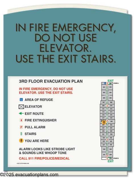 - Post directly above the elevator call button with the top of the sign 72" above floor to instruct people to use the stairs in the event of an emergency, not the elevator.