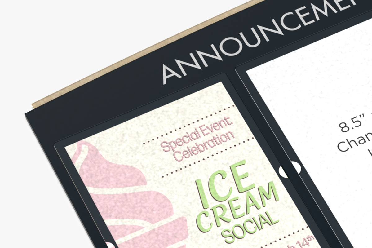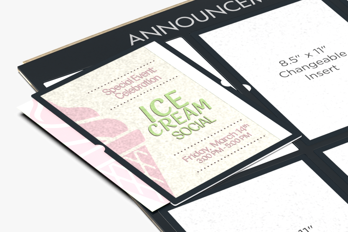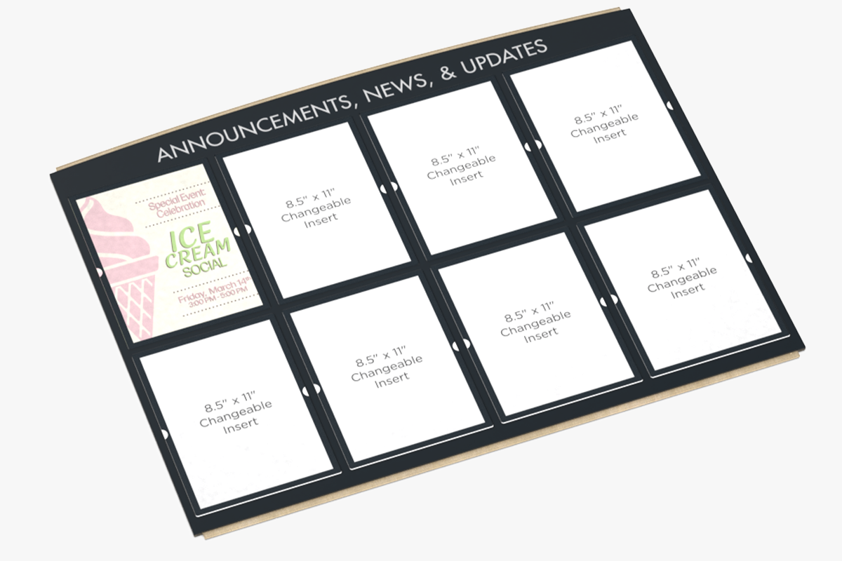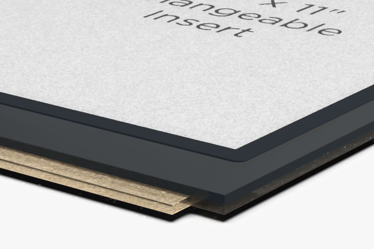 • Eight (8) insert holders with protective lens covers accommodate printed 8.5" x 11" pieces of standard paper.