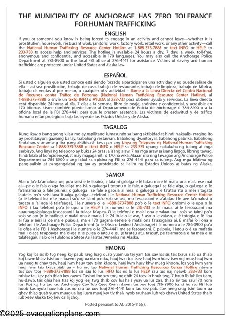 Protect guests and meet municipal requirements with the Anchorage Alaska Human Trafficking Post (GSS-HT128C-AK). This multilingual compliance sign fulfills Anchorages AO 2016-115(S) and Alaska Code § 16.90.05, ensuring facilities meet posting requirements for public awareness and victim assistance.