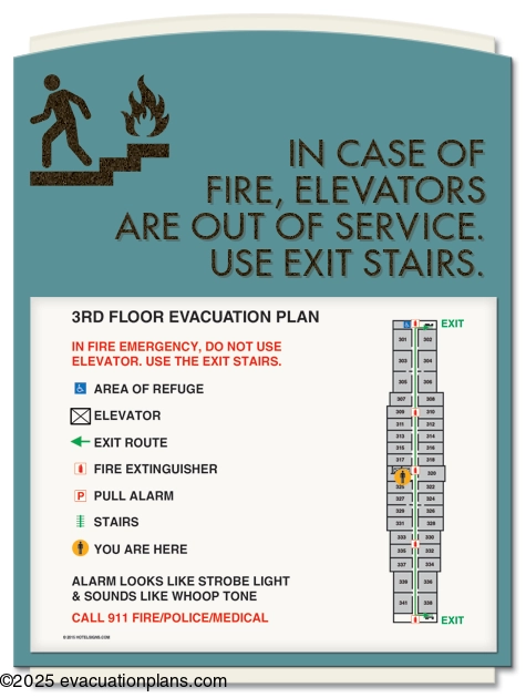 - Post adjacent to elevator call button with bottom edge of map no more than 48" above floor to instruct people to use the stairs in the event of an emergency, not the elevator.